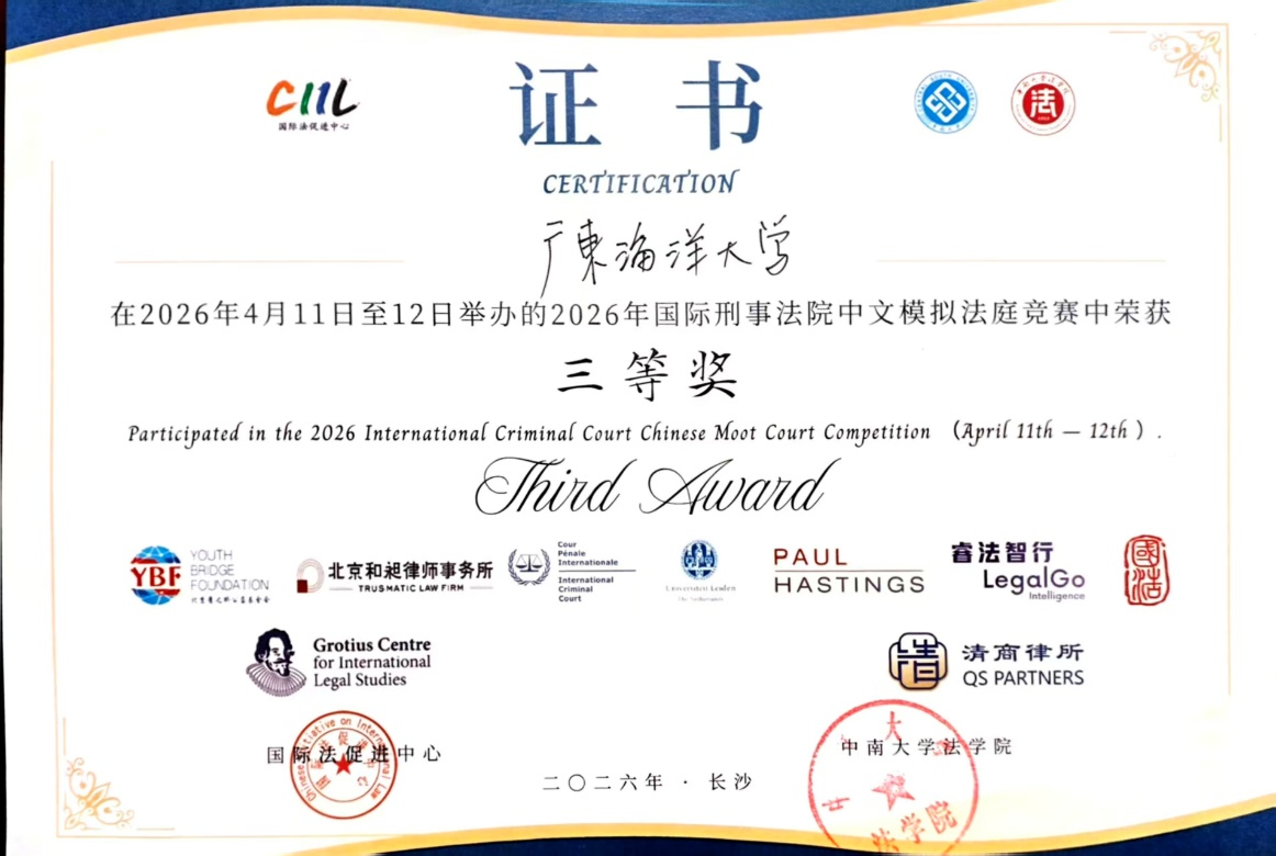 近日,2026年国际刑事法院中文模拟法庭竞赛(ICC中文赛)国内轮正赛在湖南长沙中南大学落幕。由我校法学1231刘弋渲、法学1233陈伟滢和法学1236李思语担任庭辩员,法学1231钟卓彤和法学1237沈馨熳担任研究员,海洋法与国际法学系副主任曲明姬老师和法学1242罗声玲担任教练。凭借着扎实的法学功底和出色的庭辩表现,我院学子从全国百余所高校代表队中脱颖而出,荣获全国三等奖,充分展现了广海法学学子的专业素养和综合实力。