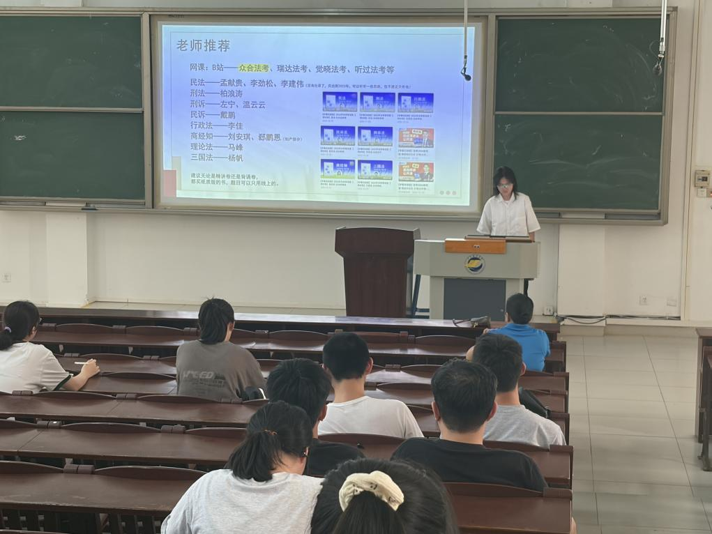 为进一步营造勤学善思、笃行致远的优良学风,全力提升法考通过率,助力毕业生高质量就业,为社会输送更多高素质法治人才,我院于2026年4月22日下午,召开2023级法学专业法考动员会暨法律实务技能卓越班开班大会。法律实务技能卓越班指导老师江婷烨博士、2023级法学专业辅导员邱日梅老师、2022级法学专业高分通过法考的蔡纯同学,以及2023级法学专业学生参加本次会议。